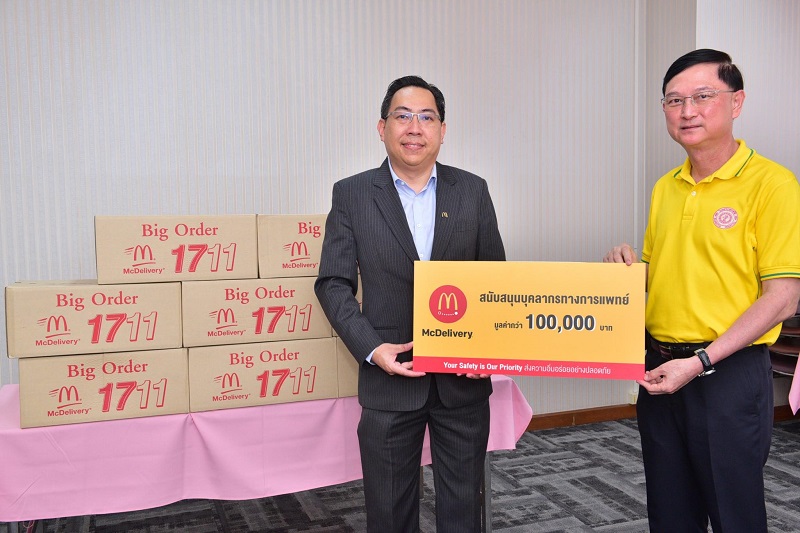บริษัท แมคไทย จำกัด ได้ส่งมอบหลากหลายเมนูแสนอร่อยจากแมคโดนัลด์ ให้ทุกคนได้อิ่มอร่อยอย่างปลอดภัยผ่านบริการแมคดิลิเวอรี ประกอบด้วย เบอร์เกอร์หมู เบอร์เกอร์ไก่เปปเปอร์ ไก่กรอบเต็มแมค แมควิงส์ แพนเค้ก ซอสเซจหมู ซอเซจ แมคมัฟฟิน พายช็อกโกแลต พายข้าวโพด พายสับปะรด ซันเดช็อกโกแลต แมคคาเฟ่ช็อกโกแลตเย็น เครื่องดื่มโค้ก รวมกว่า 10,000 ชิ้น มูลค่า 500,000 บาท เพื่อแสดงความห่วงใยและเป็นกำลังใจให้กับบุคลากรที่ปฏิบัติงานในกว่า 35 องค์กร ทั่วประเทศ ทั้งในกรุงเทพฯ และต่างจังหวัด อาทิ โรงพยาบาลจุฬาลงกรณ์ สภากาชาดไทย, โรงพยาบาลศิริราช, โรงพยาบาลราชวิถี, สถาบันบำราศนราดูร, สถาบันสุขภาพเด็กแห่งชาติมหาราชินี กรมการแพทย์, โรงพยาบาลกล้วยน้ำไทย พระราม 4, โรงพยาบาลตำรวจ, โรงพยาบาลชลบุรี, โรงพยาบาลเมืองพัทยา, โรงพยาบาลพานทอง, โรงพยาบาลมหาวิทยาลัยบูรพา, โรงพยาบาลแกลง, โรงพยาบาลหาดใหญ่, โรงพยาบาลสงขลานครินทร์, โรงพยาบาลทุ่งสง, โรงพยาบาลองค์การบริหารส่วนจังหวัดภูเก็ต, โรงพยาบาลมิชชั่น, โรงพยาบาลวชิระภูเก็ต, โรงพยาบาลเกาะพีพี, โรงพยาบาลป่าตอง, โรงพยาบาลมหาราชนครเชียงใหม่, โรงพยาบาลประสาท โรงพยาบาลหางดง โรงพยาบาลพุทธชินราช และศูนย์ศรีพัฒน์ คณะแพทยศาสตร์ มหาวิทยาลัยเชียงใหม่, สถานีตำรวจภูธรเชิงทะเลภูเก็ต จุดตรวจคัดกรอง สถานีตำรวจภูธรวิชิต, สถานีตำรวจภูธรกะทู้, สถานีตำรวจภูธรบ่อผุด, ศูนย์กู้ภัยวัดปลายแหลม, จุดตรวจคัดกรองด่านบางหัก, จุดตรวจคัดกรองด่าน จ.สมุทรปราการ, จุดตรวจคัดกรองด่านแจ้งวัฒนะ เป็นต้น