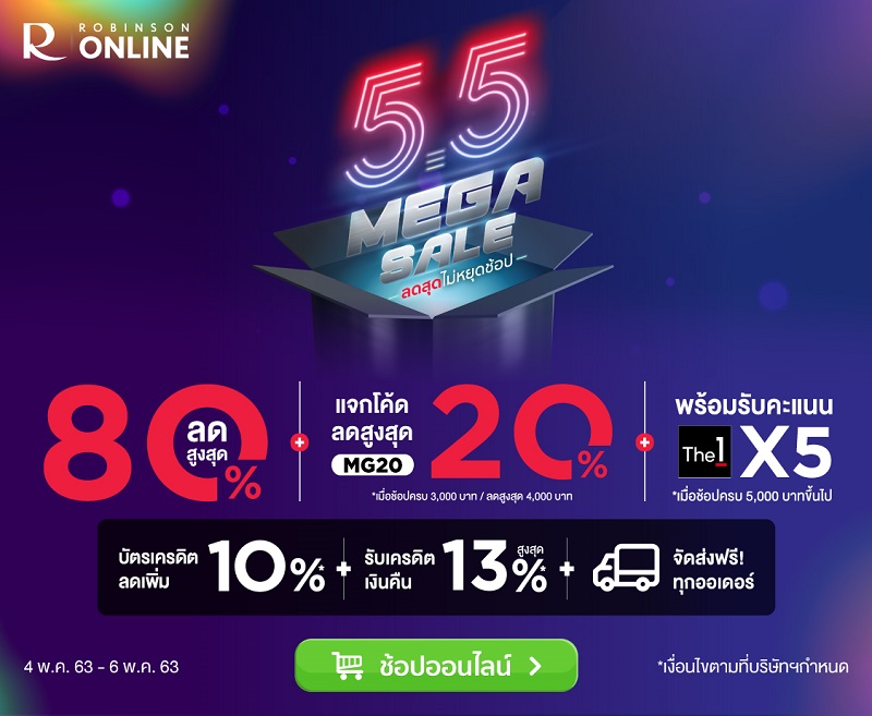 สายช้อปออนไลน์ไม่ควรพลาด! กับแคมเปญ ‘5.5 MEGA SALE ลดสุดไม่หยุดช้อป’ ระหว่างวันที่ 4 – 6 พฤษภาคม 2563 ที่ ROBINSON ONLINE คลิก https://www.robinson.co.th/th