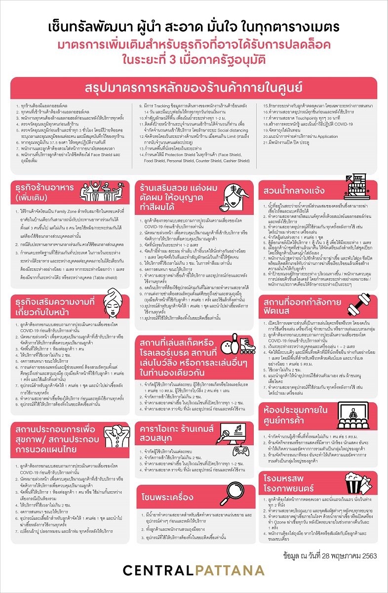 หลังจากภาครัฐ ประกาศให้กิจการและกิจกรรมระยะ 3 เปิดดำเนินการได้ CPN ได้เตรียมมาตรการเสริมสำหรับกลุ่มธุรกิจประเภท 3 เพิ่มเติม ซึ่งจะมีกิจการกลับมาเปิดปกติ 10 ประเภทธุรกิจ อาทิ