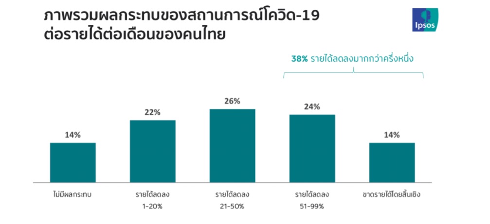 ผลวิจัยล่าสุดจาก อิปซอสส์ (Ipsos) บริษัทวิจัยการตลาด เผยว่า Covid-19 ทำให้คนไทยกว่า 38% รายได้หายไปกว่า 50% และกว่า 14% ของคนไทย “ขาดรายได้โดยสิ้นเชิง” หรือมีรายได้เป็นศูนย์ โดยผลกระทบมากที่สุด คือ ผู้มีรายได้น้อยและอาศัยอยู่ในต่างจังหวัดตามภูมิภาคต่างๆ