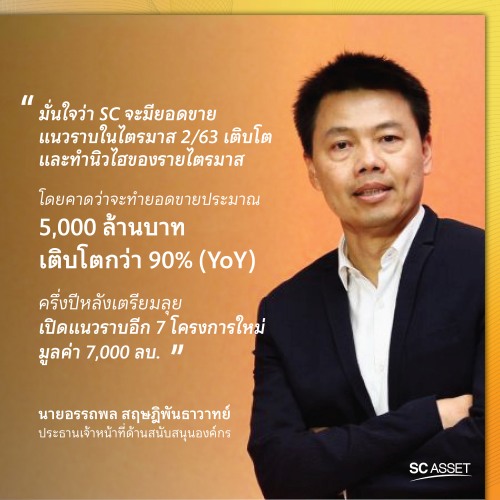 บริษัท เอสซี แอสเสท คอร์ปอเรชั่น จำกัด (มหาชน) หรือ SC ผู้พัฒนาสินค้าคุณภาพ และส่งมอบ living solutions เพื่อสร้างทุกเช้าที่ดีให้กับลูกค้าทุกคน โดยนายอรรถพล สฤษฎิพันธาวาทย์ ประธานเจ้าหน้าที่ด้านสนับสนุนองค์กร เปิดเผยว่า “ เรามั่นใจว่าบริษัทจะมียอดขายแนวราบในไตรมาส 2/63 เติบโตและทำนิวไฮของรายไตรมาส โดยคาดว่าจะทำยอดขายประมาณ 5,000 ล้านบาท เติบโตกว่า 90% (YoY) ทั้งนี้ เนื่องจากบ้านเป็น Real demand ที่เป็นทั้งที่อยู่อาศัย และ เป็น Second Workplace สำหรับผู้บริโภคระหว่างช่วงอยู่บ้าน ทำให้มีความต้องการบ้านที่มีพื้นที่ขนาดใหญ่ขึ้น โดยตลอดเดือนเม.ย-พ.ค.ที่ผ่านมา พบว่ามียอด walk และจองสูงเป็น 2 เท่าของไตรมาส 1/63 ผลสำเร็จสืบเนื่องจากการที่บริษัทใช้กลยุทธ์ออนไลน์เชิงรุก พร้อมกับมีบ้านที่ดีไซน์และออกแบบมาเพื่อตอบโจทย์ลูกค้าเป็นอย่างดี และรวมถึงการตอบรับที่ดีต่อเนื่องของโครงการบ้านเดี่ยว 4 โครงการ มูลค่าโครงการรวม 5,000 ล้านบาท ที่เปิดในไตรมาส 2 ”