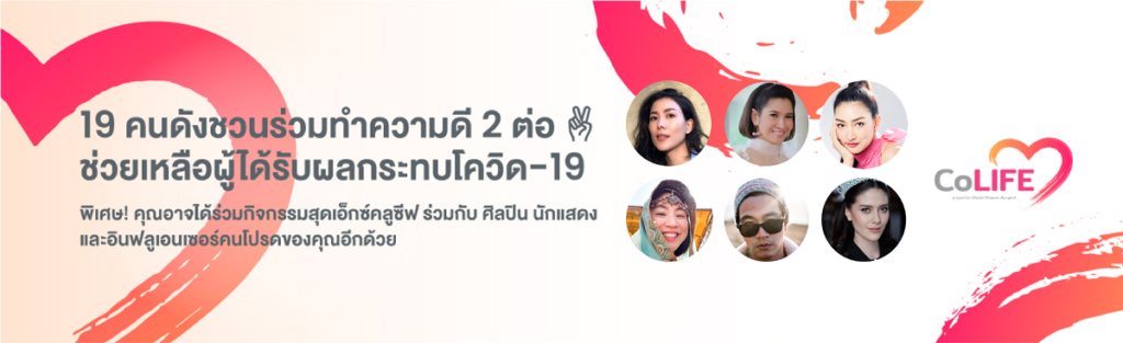 6 องค์กรเพื่อสังคม นำโดย Global Shapers Bangkok มูลนิธิยุวพัฒน์ และภาคีเครือข่าย ร่วมผลักดัน “โครงการ CoLIFE” เชิญชวนคนไทยร่วมบริจาคเงินผ่าน บัญชี มูลนิธิยุวพัฒน์ กับ “คนดัง คนโปรด” เร่งส่งมอบถุงยังชีพช่วยเหลือ 10,000 ครอบครัวกลุ่มคนเปราะบางที่ได้รับผลกระทบจากสถานการณ์ Covid–19 พร้อมอุดหนุนเกษตรกรไทย โดยได้แรงหนุนจากคนดัง 19 คน ร่วมรณรงค์ให้เกิดการบริจาคแบบ “ทำดี 2 ต่อ” ช่วยทั้งกลุ่มคนเปราะบางและเกษตรกร