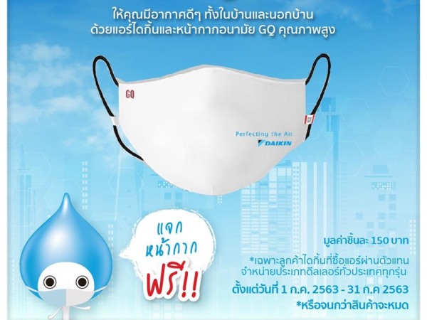 “ไดกิ้น” เปิดตัวโปรโมชั่นแทนความห่วงใย เมื่อซื้อแอร์ไดกิ้นผ่านตัวแทนจำหน่ายประเภทดีลเลอร์ทุกรุ่น รับฟรีทันที! หน้ากากอนามัยคุณภาพสูงจากแบรนด์ GQ ตอกย้ำความเป็นผู้เชี่ยวชาญด้านอากาศ มอบความสะอาด สดชื่น ดูแลลูกค้าทั้งในบ้านและนอกบ้าน เผยกระแสตอบรับแคมเปญหน้าร้อน “เคียงข้างคนไทย สู้ไปกับไดกิ้น” ล้นหลาม พร้อมเดินหน้ามอบอากาศคุณภาพดีให้ลูกค้าต่อเนื่อง