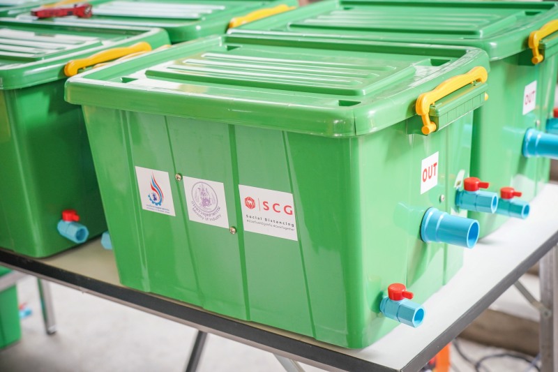 สำหรับน้ำที่ใช้งานแล้วถูกระบายจากครัวเรือนของแฟลตตำรวจทุ่งสองห้อง เอสซีจีได้ติดตั้ง “ระบบบำบัดน้ำเสียไซโคลนิก จาก เอสซีจี (Zyclonic by SCG)” จำนวน 2 ยูนิต เพื่อขจัดของเสีย และปรับปรุงคุณภาพน้ำเสียจากห้องน้ำ และน้ำเสียในครัวเรือนด้วยกระบวนการทางชีวภาพและเคมีไฟฟ้า ทำให้น้ำที่ได้ปราศจากเชื้อโรค สี และกลิ่น สามารถนำน้ำกลับมาใช้ใหม่ได้อย่างมีประสิทธิภาพ เช่น นำไปรดน้ำต้นไม้ ใช้ในชักโครก หรือทำความสะอาดทั่วไปในพื้นที่ส่วนกลางของชุมชน โดยถังบำบัดน้ำเสีย 1 ยูนิต จะสามารถบำบัดน้ำเสียได้ถึง 600 ลิตรต่อวันทั้งยังมีขนาดเล็ก จึงติดตั้งและดูแลรักษาได้ง่าย และสามารถนำไปเชื่อมต่อกับบ่อเกรอะ และบ่อพักน้ำเสียของอาคารได้ทันที ถือเป็นนวัตกรรมเพื่อสุขอนามัยที่ยั่งยืนที่ได้รับการพัฒนาต่อยอดมาจากระบบสุขาปลอดเชื้อที่ธุรกิจเคมิคอลส์ เอสซีจี ร่วมพัฒนาขึ้นกับสถาบันเทคโนโลยีแห่งเอเซีย (เอไอที) ภายใต้การสนับสนุนของมูลนิธิบิล และเมลินดา เกตส์