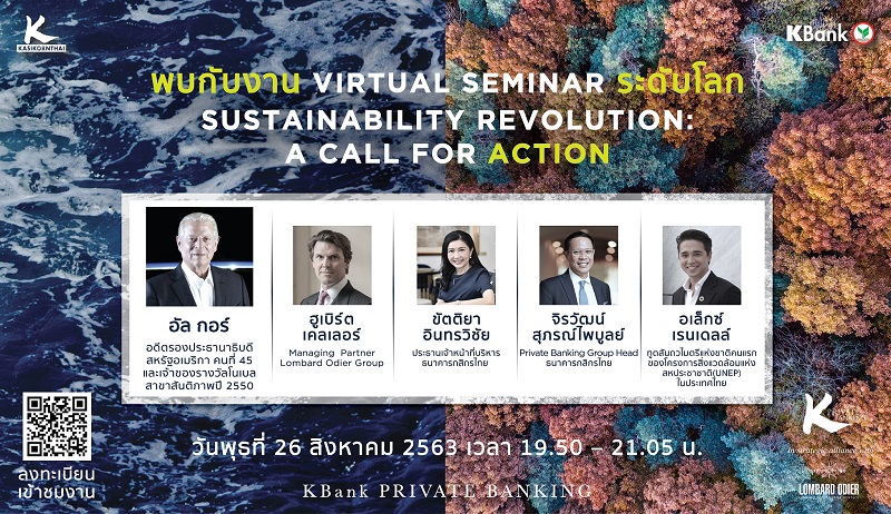 KBank Private Banking จัดงานสัมมนาออนไลน์ครั้งยิ่งใหญ่ ภายใต้ชื่อ “SUSTAINABILITY REVOLUTION: A CALL FOR ACTION” พร้อมด้วยพันธมิตร ลอมบาร์ด โอเดียร์ (Lombard Odier) ผู้ให้บริการไพรเวทแบงก์ระดับโลกจากสวิตเซอร์แลนด์ โดยมีเป้าหมายเพื่อผลักดันการลงทุนอย่างยั่งยืน