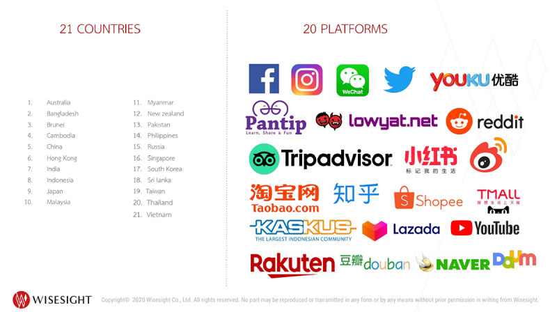 โดยวิธีการดังกล่าว ปัจจุบัน Wisesight สามารถเข้าถึงข้อมูลโซเชียลมีเดียใน 21 ประเทศ ประกอบด้วย ไทย, จีน, รัสเซีย, ญี่ปุ่น, เกาหลีใต้, ไต้หวัน, บังกลาเทศ, ปากีสถาน, ฮ่องกง, เมียนมาร์, เวียดนาม, อินเดีย, ศรีลังกา, กัมพูชา, มาเลเซีย, บรูไน, ฟิลิปปินส์, สิงคโปร์, อินโดนีเซีย, ออสเตรเลีย และนิวซีแลนด์ จากแพลตฟอร์มทั้งหมด 20 แพลตฟอร์ม ดังภาพ