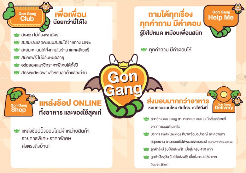 1. GON Gang Club บริการลูกค้าสมาชิก ภายใต้คอนเซ็ปต์ “เพื่อเพื่อนน้อยกว่านี้ได้ไง” ที่มอบความสะดวกให้มากกว่า ด้วยการสะสม ตรวจสอบและแลกคะแนนได้บน LINE ไม่ต้องพกบัตร พร้อมจัดเต็มด้วยสิทธิพิเศษมากมาย ได้แก่ การลงทะเบียนสมัครสมาชิกฟรี ไม่มีวันหมดอายุ รวมถึงโปรโมชั่นเมนูสมาชิกราคาสุดพิเศษ ตลอด 365 วัน และสิทธิประโยชน์ที่จะคัดสรรสำหรับสมาชิกเฉพาะบุคคลและอีกมากมายที่จะทยอยเปิดตัวออกมาภายในเดือนกันยายนนี้