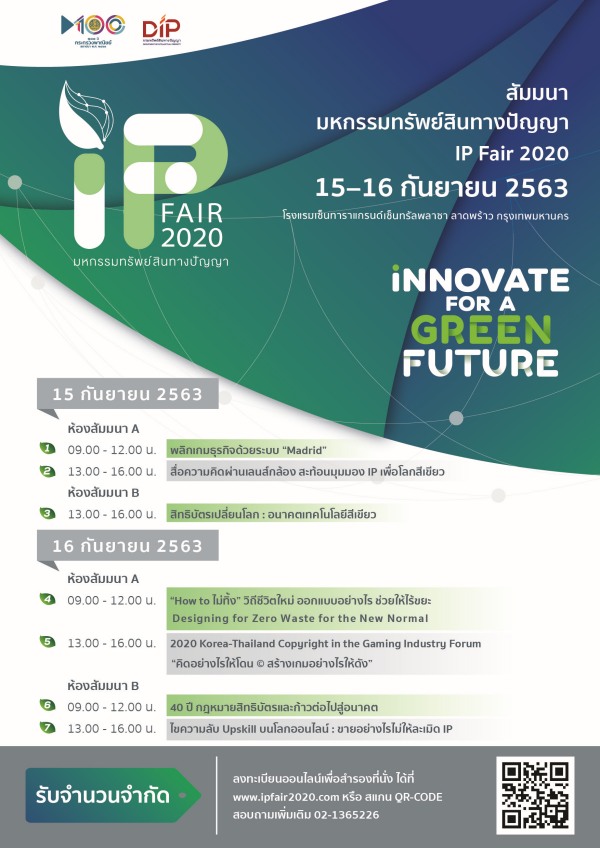 ทั้งนี้ กรมทรัพย์สินทางปัญญา ขอเรียนเชิญผู้ประกอบการที่สนใจเข้าร่วมงานสัมมนา สามารถสมัครเข้าร่วมงานดังกล่าวได้โดยไม่เสียค่าใช้จ่าย สามารถลงทะเบียนออนไลน์เพื่อสำรองที่นั่งได้ที่ www.ipfair2020.com หรือแสกน QR – Code และสอบถามเพิ่มเติมที่ 02-1365226