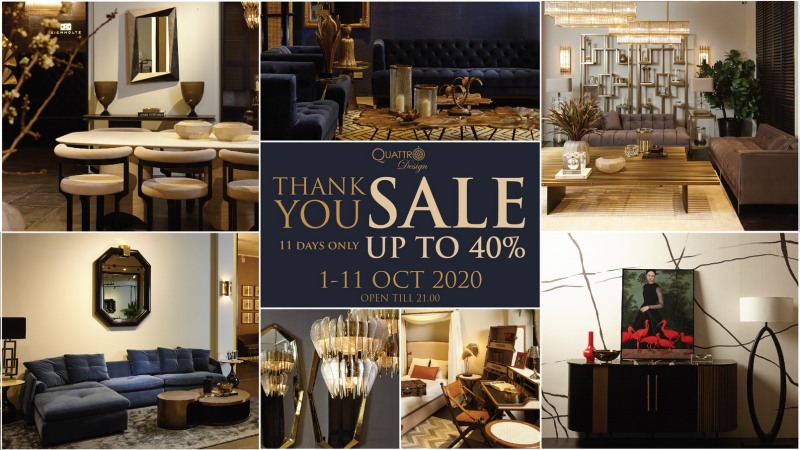 “Quattro Design Thank You Sale” พบกับเฟอร์นิเจอร์ ของแต่งบ้าน และโคมไฟนำเข้าชิ้นสวยให้เลือกซื้อ ด้วยส่วนลดสูงสุด 40% พร้อมมาตรการด้านสุขอนามัย และความสะอาดทางสาธารณสุข ณ QUATTRO DESIGN FLAGSHIP STORE โครงการ A Square สุขุมวิท 26 ระหว่างวันที่ 1-11 ตุลาคม 2563 เวลา 10.00 – 21.00 น. โทรศัพท์ 0-2116-6945