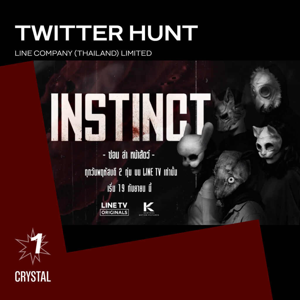“LINE Twitter Hunt” คือการโปรโมท LINE TV Originals ซีรีส์ เรื่อง INSTINCT ซ่อน ล่า หน้าสัตว์ ที่มีเรื่องราวเกี่ยวกับ “แก๊งหน้ากากสัตว์” ที่จะระบายความเก็บกดของตัวเองโดยการออกตามล่าและพิพากษาเหล่าอาชญากรโรคจิตที่แฝงตัวอยู่ในสังคม โดยการโปรโมทซีรีส์เรื่องนี้ได้มีการตั้งค่าการมองเห็นโฆษณา ที่มีเงื่อนไขว่า ถ้าหากผู้ใช้พิมพ์ข้อความหรือเสิร์ชคำหยาบหลายๆ ครั้ง จะเห็นโฆษณาของหนังเรื่องนี้ ขณะเดียวกันได้ใช้ทวิตเตอร์ในการสร้างกระแสในโลกออนไลน์ ผ่านการติดแฮชแทค #ซ่อนด้านมืดไว้ให้ดี #INSTINCT ทำให้มีผู้ใช้งานหลายคนได้ลองทำตามจนเกิดเป็นเทรนด์ในโลกออนไลน์