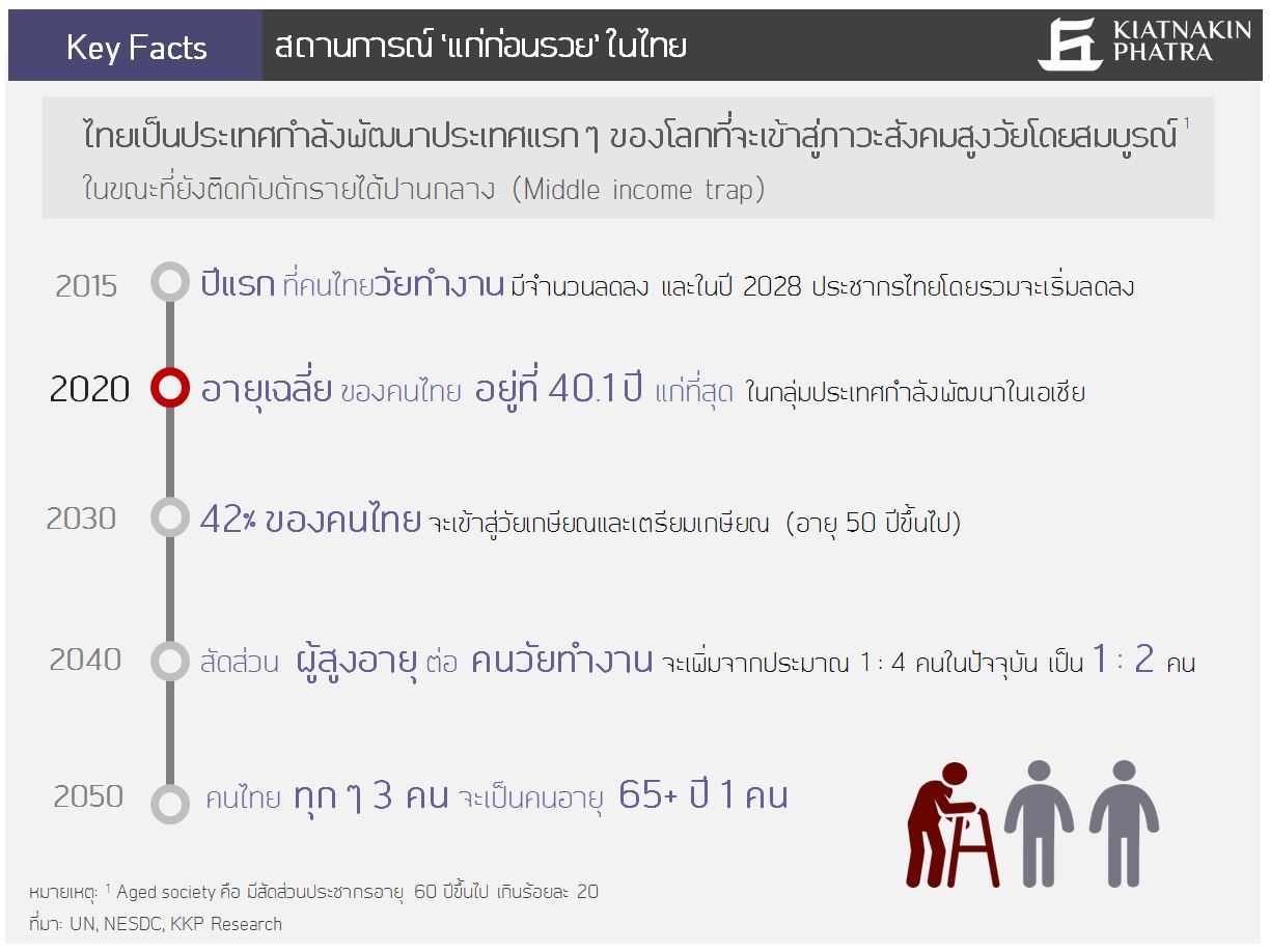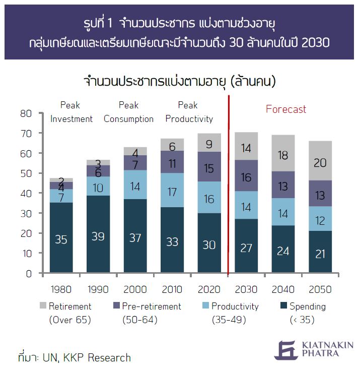 จากข้อมูลพบว่า ในปี 2562 ไทยมีสัดส่วนผู้สูงวัยประมาณ 18% ของประชากรทั้งหมด และคาดการณ์ว่าภายในปี 2573 จำนวนผู้สูงวัยจะเพิ่มขึ้นเป็น 40% หรือประมาณ 30 ล้านคน ซึ่งจะส่งผลให้ไทยก้าวสู่สังคมสูงวัยอย่างสมบูรณ์แบบ และเมื่อไทยกลายเป็นสังคมสูงวัย คำถามที่ตามมาคือ จะก่อให้เกิดการเปลี่ยนแปลงต่อเศรษฐกิจ สังคม และธุรกิจอย่างไร KKP Research โดยเกียรตินาคินภัทร ได้เผยบทวิเคราะห์ “ทศวรรษถัดไปของไทย ธุรกิจโตอย่างไรเมื่อคนไทยกว่า 40% เข้าสู่วัยเกษียณ” เพื่อสะท้อนให้เห็นถึงความท้าทายทางเศรษฐกิจที่ไทยต้องเจอ รวมถึงธุรกิจแบบไหนที่จะตอบโจทย์สังคมสูงวัยเพื่อสร้างความเข้าใจและเตรียมพร้อมรับมือกับการโครงสร้างประชากรที่กำลังเปลี่ยนไปในอีก 10 ปีข้างหน้านี้