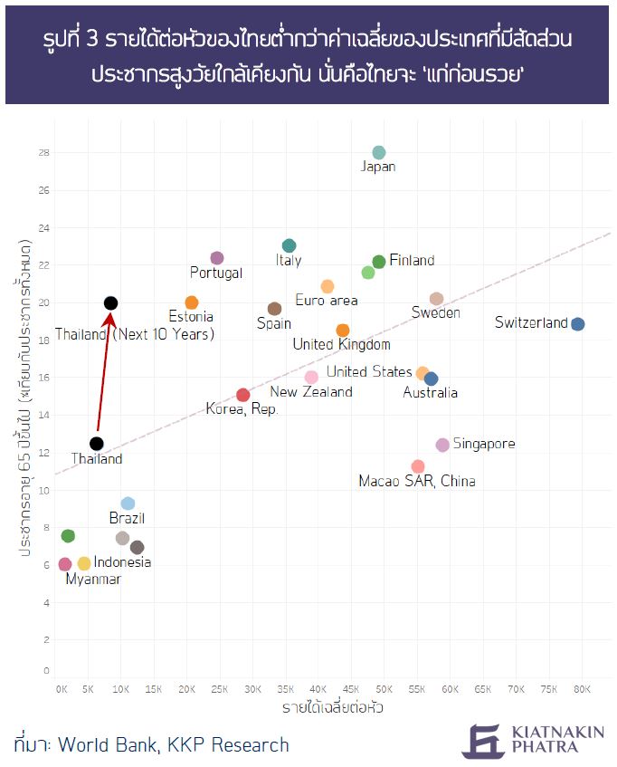 แต่ในอีก 10 ปีข้างหน้า โครงสร้างประชากรทั้ง 3 กลุ่มที่เคยเป็นแรงขับเคลื่อนให้กับเศรษฐกิจในช่วงก่อนหน้าจะลดจำนวนลง จากการก้าวสู่ภาวะสังคมสูงวัยอย่างรวดเร็ว และทำให้ไทยกลายเป็นประเทศสังคมสูงวัยอย่างสมบูรณ์ในปีหน้า เป็นประเทศที่สองของอาเซียนรองจากสิงคโปร์ กลุ่มคนที่เตรียมเกษียณอายุ (Pre-retirement) หรือเกษียณอายุแล้ว (Retirement) จะมากขึ้นและจะมีสัดส่วนเกินกว่า 40% ของประชากรไทยทั้งหมดในปี 2030 ซึ่งการเปลี่ยนแปลงเชิงโครงสร้างนี้ได้เริ่มส่งผลต่อเศรษฐกิจไทยที่ชะลอตัวลงอย่างต่อเนื่องในช่วงหลายปีที่ผ่านมา และกำลังจะรุนแรงขึ้น ซึ่งเชื่อมโยงกับปัญหาเชิงโครงสร้างอื่น ๆ ในอีกหลากหลายมิติ