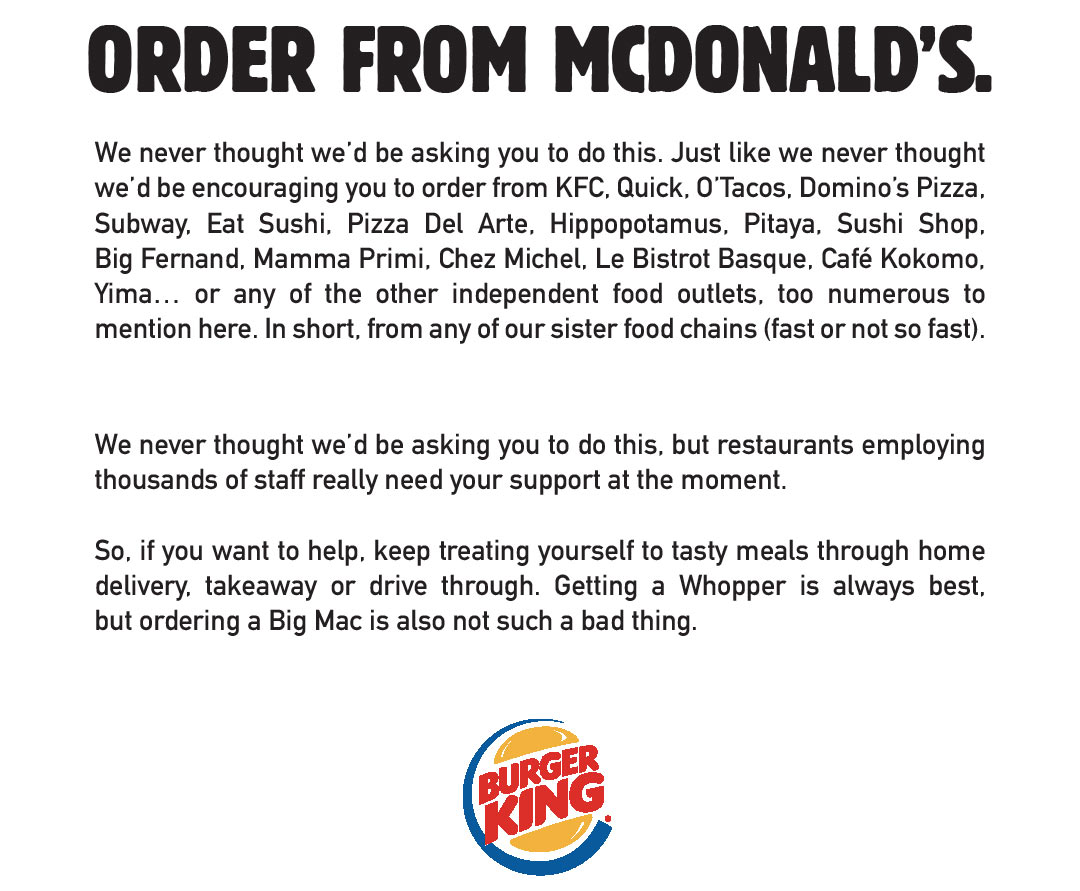 ปลายปี ที่สถานการณ์ Covid-19 ในยุโรปหลายประเทศต้องล็อกดาวน์หลายรอบ จนธุรกิจร้านอาหาร้องประสบกับความยากลำบาก Burger King ในอังกฤษและฝรั่งเศส จึงผุดแคมเปญที่บอกว่า “ให้สั่งอาหารจาก McDonald’s”กระตุ้นความสนใจด้วยการบอกให้สั่งสินค้าจากคู่แข่งคนสำคัญ และสั่งอาหารจากร้านค้าขนาดเล็กแทน เพราะร้านค้าเหล่านี้ก็มีพนักงานที่ต้องดูแลนับหมื่นคน ต่อมาเดือนธันวาคม Burger King เดินหน้าแคมเปญช่วยเหลือร้านอาหารต่อเนื่องด้วยการยกพื้นที่โซเชี่ยลมีเดีย เช่น Instagram ของแบรนด์ให้เป็นพื้นที่โฆษณาของร้านเล็กๆ หยิบเอาร้าน SMEs มาโปรโมททีละแบรนด์ๆ งานนี้ได้ใจจริง!
