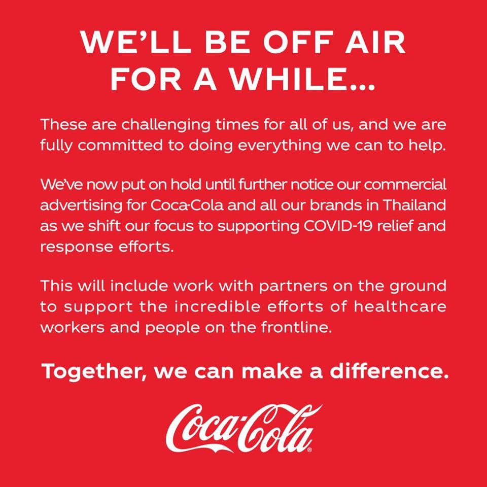 แคมเปญระดับโลก ที่เกิดขึ้นในหลายประเทศ แต่สร้างแรงสั่นสะเทือนในวงการโฆษณาอย่างมาก เมื่อเดือนมีนาคม Coca-Cola ฟิลิปปินส์ “ประกาศงดโฆษณา” เพื่อนำเงินไปช่วยเหลือพนักงาน คู่ค้า และสังคม ผ่านการบริจาคให้กับบุคลากรทางการแพทย์ หน่วยงานที่ช่วยเหลือ Covid-19 หลังจากนั้น ทางฝั่งของประเทศไทยก็เดินตามรอย ประกาศ “หยุดโฆษณา” บ้าง แคมเปญนี้ด้านหนึ่งได้ใจผู้บริโภค ที่มองว่าโค้กเสียสละการสร้างการรับรู้ แต่โยกเงินมาช่วยเหลือสังคม แต่อีกด้านเอเจนซี่ที่ดูแลงานสื่อสารโฆษณาประชาสัมพันธ์ทั้งหลาย คงต้องทำใจแบบจำใจกันไป