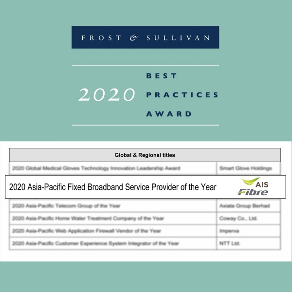แต่ด้วยระยะเวลา 5 ปีที่ยากจะคาดเดานั้นเอง เอไอเอสไฟเบอร์ก็ได้พิสูจน์ตัวเอง ด้วยการก้าวขึ้นมาเป็นผู้ให้บริการอินเทอร์เน็ตบรอดแบนด์ยอดเยี่ยมแห่งปี 2020 ในระดับภูมิภาคเอเชีย-แปซิฟิก (2020 Asia–Pacific Fixed Broadband Service Provider of the Year) ภายใต้การการันตีของ Frost & Sullivan องค์กรให้คำปรึกษาทางธุรกิจและการวิจัยเชิงรุกที่มีชื่อเสียงในวงการมายาวนานกว่า 50 ปีได้สำเร็จ