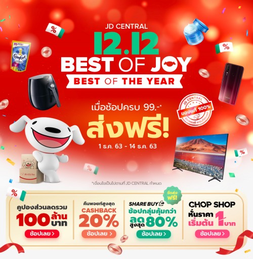สำหรับแคมเปญ JD CENTRAL 12.12 BEST OF JOY, BEST OF THE YEAR นี้ เจดีเซ็นทรัลได้จัดส่งความสุขครั้งยิ่งใหญ่ด้วยการรวมโปรเด็ดจากแบรนด์ดังรวม กว่า 10,000 รายการ ด้วยส่วนลดสูงสุดกว่า 90% รวมมูลค่าส่วนลดกว่า 100 ล้านบาท โดยให้ลูกค้าได้เริ่มอุ่นเครื่องช้อปตั้งแต่วันนี้ -11 ธันวาคมนี้กับโปรโมชั่นแบบ Theme Day ที่จะสับเปลี่ยนสินค้าไม่ซ้ำหมวดหมู่มาในข้อเสนอสุดพิเศษ และเริ่มดีลสุดร้อนแรงในวันที่ ระหว่าง 12-14 ธันวาคม อันได้แก่