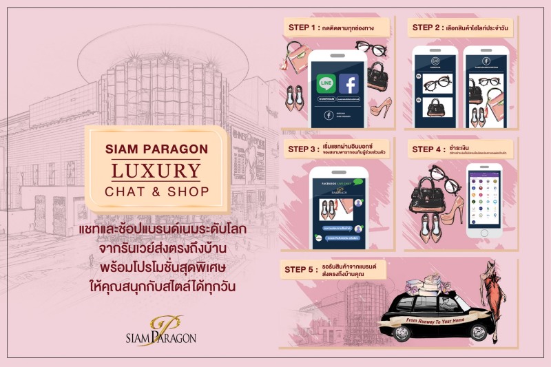 บริการการช้อปปิ้งแบบเหนือระดับส่งตรงถึงหน้าบ้าน Luxury Chat & Shop มีหลากหลายแบรนด์ดังระดับโลกให้เลือกอย่างมากมาย อาทิ Balenciaga, Bally, Boss Hugo Boss, Bottega Veneta, Burberry, BVLGARI, Coach, Dolce&Gabbana, Fendi, Furla, Givenchy, Gucci, Jimmy Choo, Loewe, Kwanpen, Longchamp, MaxMara, MCM, Mulberry, Michael Kors, Off-White, Paul Smith, PRADA, Philipp Plein, Salvatore Ferragamo , Tiffany & Co., Versace ฯลฯ โดยมีขั้นตอนการช้อปปิ้งผ่านช่องทางออนไลน์ทั้งจากแอปพลิเคชั่น และ Line @OneSiam ที่สะดวก รวดเร็ว ไม่ยุ่งยาก ทำได้ทุกที่ดังนี้