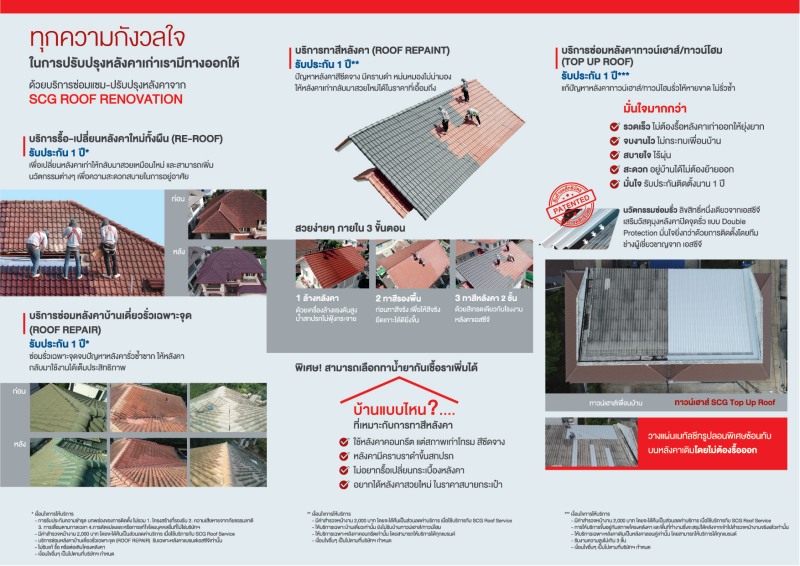 ส่วนทาวน์เฮาส์และทาวน์โฮม จบปัญหาหลังคารั่วซ้ำซากได้ด้วยวิธีการซ่อมแบบ TOP UP ROOF ลิขสิทธิ์หนึ่งเดียวจากเอสซีจี เสริมวัสดุมุงหลังคาปิดจุดรั่ว แบบ Double Protection โดยวางแผ่นเมทัลชีทรูปลอนพิเศษซ้อนทับบนหลังคาเดิม มั่นใจยิ่งกว่าด้วยการติดตั้งโดยทีมช่างผู้เชี่ยวชาญจากเอสซีจี งานเสร็จรวดเร็ว ไม่ต้องรื้อหลังคาเก่าออกให้ยุ่งยาก สะดวก อยู่บ้านได้ไม่ต้องย้ายออก และไม่กระทบเพื่อนบ้าน มั่นใจ รับประกันติดตั้งนาน 1 ปี