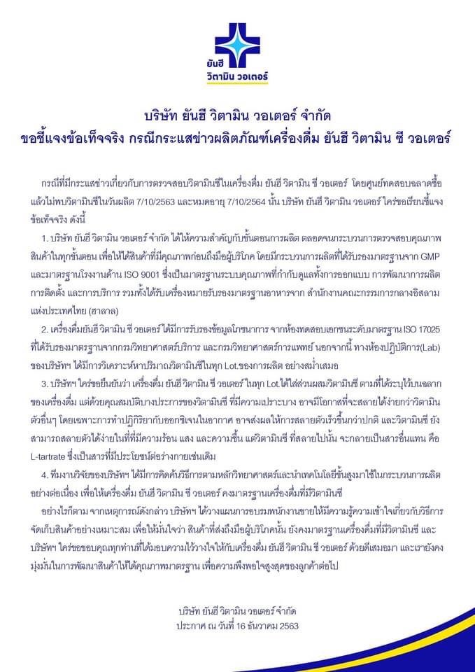 3.บริษัทฯ ใคร่ขอยืนยันว่าเครื่องดื่ม ยันฮี วิตามิน ซี วอเตอร์ ในทุก Lot.ได้ใส่ส่วนผสมวิตามินซี ตามที่ได้ระบุไว้บนฉลากของเครื่องดื่ม แต่ด้วยคุณสมบัติบางประการของวิตามินซี ที่มีความเปราะบาง อาจมีโอกาสที่จะสลายได้ง่ายกว่าวิตามินตัวอื่นๆ โดยเฉพาะการทำปฏิกิริยากับออกซิเจนในอากาศ อาจส่งผลให้การสลายตัวเร็วขึ้นกว่าปกติ และวิตามิน ซี ยังสามารถสลายตัวได้ง่ายในที่ที่มีความร้อน แสง และความชื้น แต่วิตามิน ซี ที่สลายไปนั้น จะกลายเป็นสารอื่นแทน คือ L-tartrate ซึ่งเป็นสารที่มีประโยชน์ต่อร่างกายเช่นเดิม