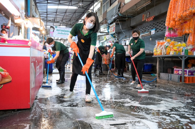 นางสาวดรุณรัตน์ อภิเกษมสันติ์ ผู้จัดการทั่วไปฝ่ายการตลาด ซีพีเอฟ พร้อมด้วย นางสาวพจมาน ธรรมสโรช ผู้จัดการกลุ่มลูกค้าธุรกิจระดับภูมิภาค กรุงเทพตอนเหนือ และ จ.นนทบุรี นำทีม ซีพี เฟรชมาร์ท เขตบางซื่อ ผนึกกำลัง ทรู ร่วมกับ นายทรงวุฒิ ทองจรัส เจ้าของตลาดเตาปูน และชุมชนบางซื่อ จัด Big Cleaning Day ในโครงการ “ยกระดับสุขอนามัย มั่นใจไร้โควิด-19” สนับสนุนน้ำยาฆ่าเชื้อ อุปกรณ์ทำความสะอาด และแจกผลิตภัณฑ์เจลแอลกอฮอล์ให้กับพ่อค้าแม่ค้า เพื่อสร้างความมั่นใจให้กับผู้บริโภคที่มาใช้บริการ ตลาดสดปลอดภัย ตอกย้ำมาตรการเฝ้าระวังการแพร่ระบาดเชื้อโควิด-19