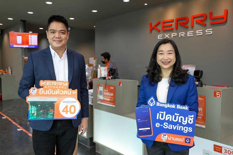 นางสาวนิรมาณ ไหลสาธิต รองผู้จัดการใหญ่ (ขวา) ธนาคารกรุงเทพ จำกัด (มหาชน) และ นายวราวุธ นาถประดิษฐ์ ประธานเจ้าหน้าที่บริหารสายงานปฏิบัติการ (ซ้าย) บริษัท เคอรี่ เอ็กซ์เพรส (ประเทศไทย) จำกัด(มหาชน) พันธมิตรในฐานะ ‘Exclusive Financial Partner’ ต่อยอดความร่วมมืออำนวยความสะดวกลูกค้าธนาคารกรุงเทพและเคอรี่ เอ็กซ์เพรส เปิดจุดให้บริการยืนยันตัวตน Be My ID ที่เคอรี่ เอ็กซ์เพรส พร้อมจัดแคมเปญโปรโมชั่นพิเศษ “สมัครปั๊บ รับทันทีคูปองส่วนลด 40 บาท”