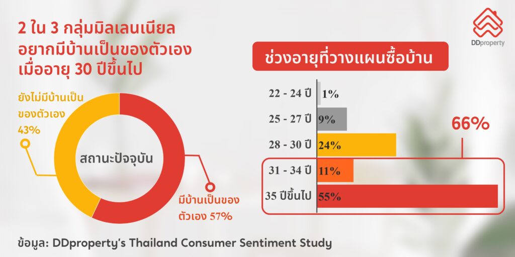 เมื่อพิจารณาด้านการครอบครองอสังหาฯ ในปัจจุบัน พบว่ายังมีสัดส่วนไล่เลี่ยกัน โดยผู้ตอบแบบสอบถามกลุ่มมิลเลนเนียลมีที่อยู่อาศัยเป็นของตัวเองแล้วถึง 57% ขณะที่อีก 43% ยังไม่ได้เป็นเจ้าของอสังหาฯ หรือมีที่อยู่อาศัยของตัวเอง โดย 2 ใน 3 ของผู้บริโภคกลุ่มนี้ (66%) วางแผนที่จะซื้อบ้านหลังแรกเมื่ออายุ 31 ปีขึ้นไป ซึ่งน่าจะเป็นช่วงวัยที่มีความพร้อมทั้งด้านหน้าที่การงานที่มั่นคงและสถานะทางการเงินเมื่อต้องเป็นหนี้ก้อนใหญ่