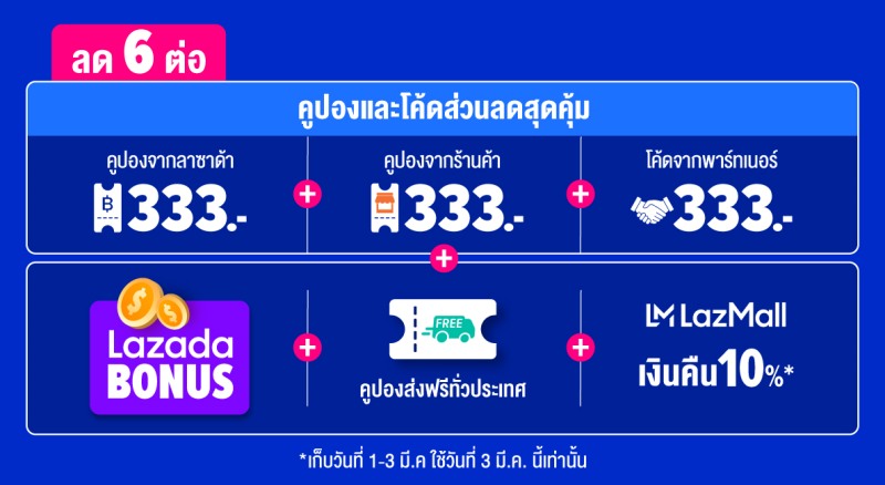 1) คูปองส่วนลดลาซาด้า มูลค่า 333 บาท (เก็บได้ตั้งแต่วันที่ 1-3 มี.ค. ทุก 10.00 น., ใช้คูปอง 3 มี.ค.)
