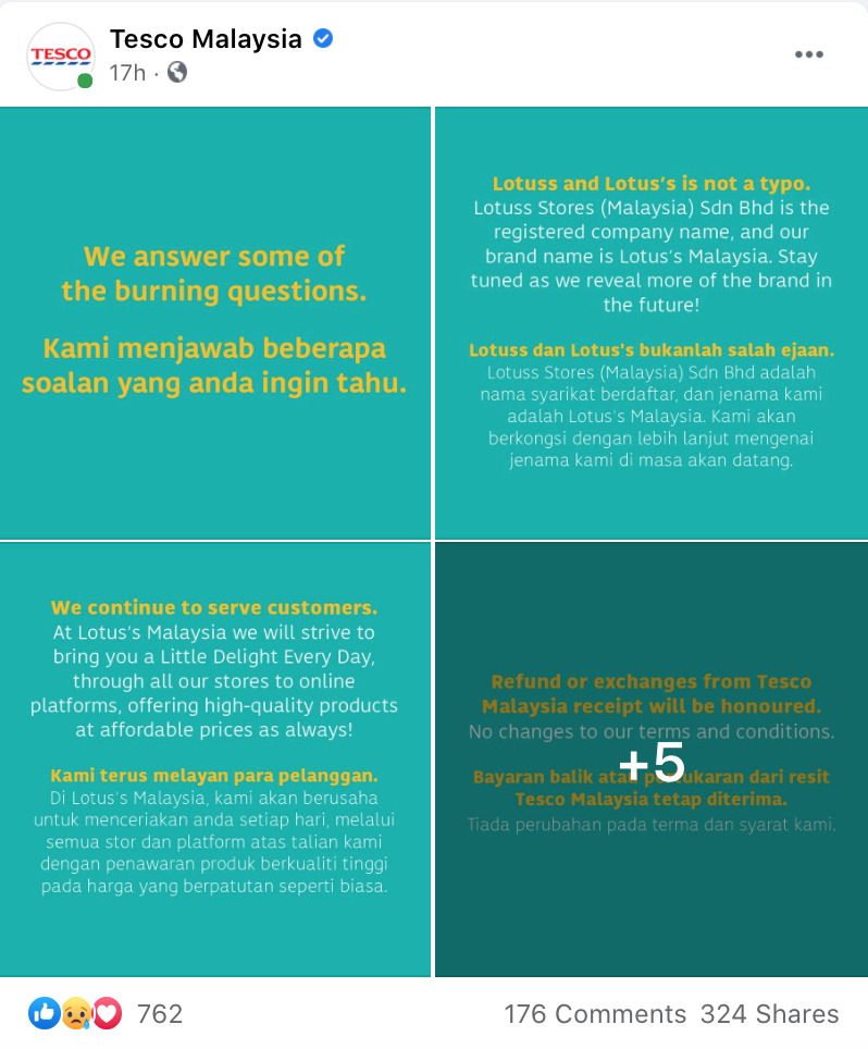สำหรับสาขาในประเทศไทยทั้ง 2,158 สาขา เป็นที่แน่ชัดแล้วว่าจะเปลี่ยนเป็น Lotus’s ส่วน 70 สาขาในมาเลเซียยังไม่แน่ชัดว่าจะเปลี่ยนชื่อเป็นอะไร อย่างไรก็ตาม CI (Corporate Identity) ของแบรนด์และดีไซน์ที่ออกมาเป็นสีเขียวพาสเทลและสีเหลืองสดใสเช่นเดียวกับประเทศไทยใช้ จึงน่าจับตาดูต่อไปว่าจะใช้ชื่อแบรนด์ Lotus’s เช่นเดียวกับประเทศไทยหรือไม่ สำหรับมาเลเซีย ทางเพจ Tesco Malaysia เริ่มสื่อสารเกี่ยวกับการเปลี่ยนโลโก้ในครั้งนี้แล้ว เพื่อทำความเข้าใจกับลูกค้า โดยระบุว่าสินค้าภายใต้แบรนด์ Tesco จะยังมีอยู่เรื่อยๆ จนกว่าสินค้าจะหมด ส่วนบริการบนแอปพลิเคชั่นต่างๆ จะยังใช้บริการได้ต่อไป