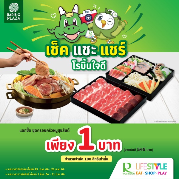 ศูนย์การค้าโรบินสันไลฟ์สไตล์ ในเครือเซ็นทรัล รีเทล จับมือ บาร์บีคิวพลาซ่า ตัวจริงเรื่องปิ้งย่าง เอาใจเหล่าเอฟซีพี่ GON ให้ได้อิ่มอร่อยในราคาสุดพิเศษ! โรบิ้นใจดี ชวนคุณมาร่วมกิจกรรม เช็ค แชะ แชร์ แลกซื้อ ชุดครอบครัวหมูสุขสันต์ ได้ในราคาเพียง 1 บาท (จากปกติ 545 บาท) ในศูนย์การค้าโรบินสันไลฟ์สไตล์ สาขาที่ร่วมรายการ