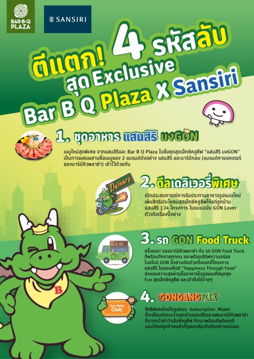 ด้านหัวเรือใหญ่จากบาร์บีคิวพลาซ่า คุณบุณย์ญานุช บุญบำรุงทรัพย์ ประธานเจ้าหน้าที่บริหารฝ่ายสร้างโอกาสทางการตลาดกลุ่มธุรกิจอาหาร บริษัท ฟู้ดแพชชั่น จำกัด เผยว่า “ถือเป็นโอกาสอันดีที่ทางบาร์บีคิวพลาซ่า ได้มาจับมือเป็นพันธมิตรหลักกับ แสนสิริ ภายใต้แนวคิด Stay with customers ซึ่งการอยู่เคียงข้างลูกค้าในช่วงสถานการณ์โควิด 19 ระลอกใหม่นั้น ถือเป็นอีกหนึ่งกลยุทธ์หลักของ ฟู้ดแพชชั่น โดยเน้นย้ำในเรื่องการให้ความสำคัญกับการดำรงชีวิตด้วยปัจจัยสี่ ท่ามกลางการเปลี่ยนแปลงของการใช้ชีวิตที่เปลี่ยนไปของผู้คน ครั้งนี้จึงเป็นการร่วมมือผนึกกำลังครั้งใหญ่ของสองอุตสาหกรรม ในการทำโมเดล Licensing Partnership จากการที่เรามีความแข็งแกร่งและเชี่ยวชาญเรื่องการทำ Character Marketing ซึ่งเป็นโอกาสอันดีในการต่อยอดสำหรับการสร้างรายได้ช่องทางใหม่ให้กับองค์กร ด้วยการใช้มาสคอต บาร์บีกอน ที่เป็นตัวแทนของความสุข ไป Stay with customers ในทุก ๆ กิจกรรมการตลาด และเพื่อสนับสนุนให้พาร์ทเนอร์ไปถึงเป้าหมายที่ต้องการ เพื่อเข้าถึงกลุ่มลูกค้าใหม่ ๆ เช่น การขยายฐานไปยังกลุ่มลูกค้าที่เป็น GON Lover สำหรับครั้งนี้จึงถือเป็นการเชื่อมต่อวงการธุรกิจร้านอาหาร และ วงการอสังหาฯ เข้าไว้ด้วยกันอย่างแท้จริง โดยได้รับผลตอบรับดีจนเกิดกระแสไวรัลแคมเปญทั้ง ออฟไลน์ และออนไลน์ ซึ่งถือเป็นการเปิดศักราชใหม่ปี 2564 ที่จะยกขบวนความอร่อยมาพร้อมโปรโมชั่น และดีลดี ๆ มากมายมากระจายความสุขให้คนไทยทั้งประเทศและลูกบ้านแสนสิริ อาทิ ชุดอาหารสุดพิเศษ “แสนสิริ มงGON” “GON Gang Delivery” “GON Food Truck” และ “GonGangFlix จาก Gon Gang Club” เพื่อสร้างรอยยิ้ม ความสนุก และ ความสุขให้แก่คนไทยทั้งประเทศ”