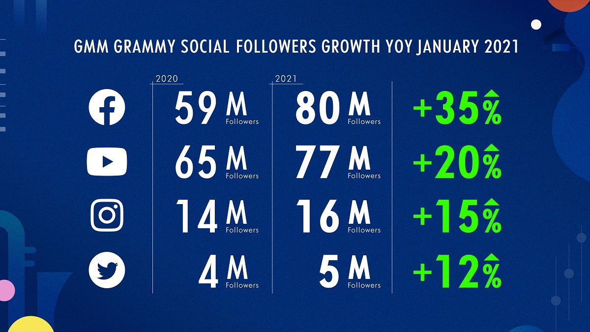 ปัจจุบัน สื่อสังคมออนไลน์ของกลุ่มจีเอ็มเอ็ม แกรมมี่ เข้าถึงผู้บริโภคมากขึ้น โดยเฟซบุ๊ก มีผู้ติดตามรวม 80 ล้านราย เพิ่มขึ้น 35% จากปี 2563 ยูทูบ มีผู้ติดตาม 77 ล้านราย เพิ่มขึ้น 20% อินสตราแกรม มีผู้ติดตาม 16 ล้านราย เพิ่มขึ้น 15% และทวิตเตอร์ มีผู้ติดตาม 5 ล้านราย เพิ่มขึ้น 12%