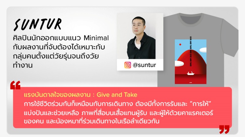 เริ่มที่หนุ่ม “SUNTUR” หรือ ซันเต๋อ ยศนันท์ วุฒิกรสมบัติกุล ศิลปินและนักวาดภาพประกอบรุ่นใหม่ที่มีผลงานโดดเด่นคนหนึ่งในยุคนี้ ซึ่งมาพร้อมกับผลงานในสไตล์มินิมอลที่มีชื่อว่า “Give and Take” มีแรงบันดาลใจจากการใช้ชีวิตก็เหมือนการดินทาง ต้องมีทั้งการรับและ “การให้” แบ่งปันช่วยเหลือ ดังนั้นภาพที่สื่อบนเสื้อจึงแทนทั้งผู้รับและผู้ให้ด้วยคาแร็คเตอร์ของคน และน้องหมาที่ร่วมเดินทางในเรือลำเดียวกัน