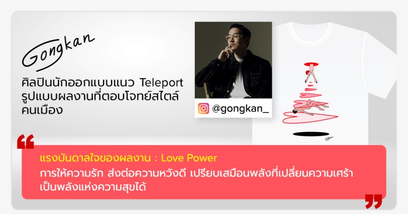 ถัดมาคือ “Gongkan” หรือ ก้อง กันตภณ เมธีกุล ศิลปินที่สร้างงานด้วยลายเส้นเรียบง่าย และมีเอกลักษณ์ที่หลุมดำทะลุมิติ (Teleport) กับผลงานออกแบบที่ชื่อ “Love Power” โดยมีแรงบันดาลใจจากการให้ความรัก ส่งต่อความหวังดี เปรียบเสมือนพลังที่เปลี่ยนความเศร้าเป็นพลังแห่งความสุขได้