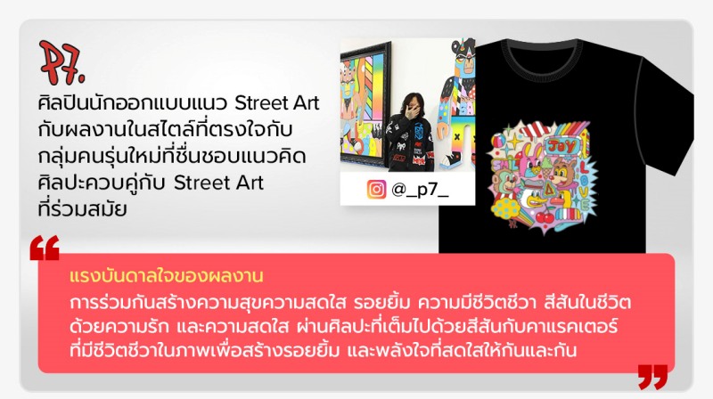 ปิดท้ายที่ ‘P7’ หรือ ‘พีระพงศ์ ลิ้มธรรมรงค์’ ที่หลายคนรู้จักในฐานะศิลปินกราฟฟิตี้และศิลปินสตรีทอาร์ตชื่อดังระดับแนวหน้าของเมืองไทย ได้ออกแบบผลงานด้วยแนวคิด “การร่วมกันให้เป็นการสร้างความสุข” มีแรงบันดาลใจจากการร่วมกันสร้างความสุขสดใส รอยยิ้ม ความมีชีวิตชีวา สีสันในชีวิตด้วยความรัก