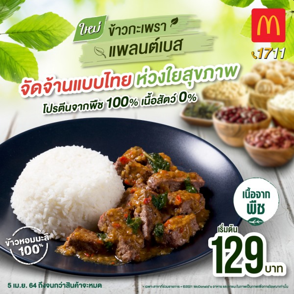 แมคโดนัลด์ เอาใจสายรักสุขภาพ เปิดตัวเมนูเนื้อจากพืช เสิร์ฟ ‘ข้าวกะเพราแพลนต์เบส’ หอม อร่อย กลมกล่อม ด้วยเนื้อแพลนต์เบสชุ่มฉ่ำ มีผิวสัมผัสเหมือนเนื้อจริง พร้อมให้โปรตีนสูง แคลอรี่ต่ำ มีส่วนประกอบหลักที่ทำจากโปรตีนพืช ได้แก่ พืชตระกูลถั่วจากธรรมชาติ, แต่งสีธรรมชาติ เช่น บีทรูทสกัดเข้มข้น และแครอทสกัดเข้มข้น ตลอดจนเพิ่มเนื้อสัมผัสที่ชุ่มฉ่ำด้วยน้ำมันมะพร้าว ให้มีลักษณะคล้ายไขมันแทรก คลุกเคล้าถึงเครื่องรสเข้มข้น หอมกะเพรา อร่อย จัดจ้าน ถูกปากคนไทย ทานกับข้าวสวยร้อนๆ จากข้าวหอมมะลิ 100% ในราคาเริ่มต้นเพียง 129 บาท (จากปกติ 169 บาท) เพิ่มเพียง 15 บาท ก็ได้อร่อยครบเซตพร้อมเติมความสดชื่นไม่อั้นกับเครื่องดื่มโค้กรีฟิลขนาด 22 ออนซ์