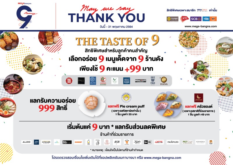 นางสาวสิรินฉัตร แสงศรี ผู้อำนวยการฝ่ายการตลาด ศูนย์การค้าเมกาบางนา เปิดเผยว่า “นับตั้งแต่เมกาบางนาได้เปิดให้บริการเมื่อปี 2555 จนถึงวันนี้ เราได้รับการตอบรับที่ดีทั้งจากพาร์ทเนอร์ ร้านค้า และลูกค้าที่เข้ามาใช้บริการ และเราเองได้พยายามสร้างสรรค์กิจกรรมเพื่อมอบประสบการณ์ที่แปลกใหม่ให้กับลูกค้าผ่านหลากหลายกิจกรรม เพื่อตอบโจทย์ความต้องการของลูกค้า และตอกย้ำว่าเมกาบางนาเป็นมากกว่าแหล่งช็อปปิ้งจับจ่ายใช้สอย แต่เราเป็น Meeting Place สำหรับทุกคน ในฐานะศูนย์การค้าที่อยู่เคียงข้างคนไทยมาตลอด 9 ปี เราจึงจัดแคมเปญพิเศษ เพื่อขอบคุณลูกค้าที่ดูแลกันและกันด้วยดีเสมอมา ภายใต้ชื่อ “May We Say Thank You” โดยได้รับความร่วมมือจากร้านค้าต่าง ๆ มากกว่า 20 ร้าน อาทิ ALDO, PANPURI, JUBILEE, KIEHL’S, SEPHORA เป็นต้น ที่พร้อมใจกันมอบส่วนลดและสิทธิพิเศษมากมายเพื่อร่วมแสดงความขอบคุณแก่ลูกค้า หรือโปรโมชั่นพิเศษให้ลูกค้าได้อิ่มคุ้มในแคมเปญ The Taste of 9 คัดสรรเมนูเด็ดจากร้านดังมามอบความคุ้มค่า ช่วยลูกค้าอร่อยคุ้มได้มากกว่าเดิม ด้วยการใช้คะแนนเมกา สไมล์ รีวอร์ดส แลกรับส่วนลดจากร้านอาหารชั้นนำ 9 ร้าน หรือแลกรับความอร่อยจากเบเกอรี่ร้านดัง 999 สิทธิ์ หรือแลกรับเครดิตเงินคืนสูงสุดถึง 12% เมื่อใช้จ่ายผ่านบัตรเครดิตที่ร่วมรายการ ทั้งหมดนี้ จะช่วยกระตุ้นการจับจ่าย ใช้สอย และช่วยให้ลูกค้าได้รับความคุ้มค่าอย่างสูงสุด เมื่อมาใช้บริการที่เมกาบางนา”