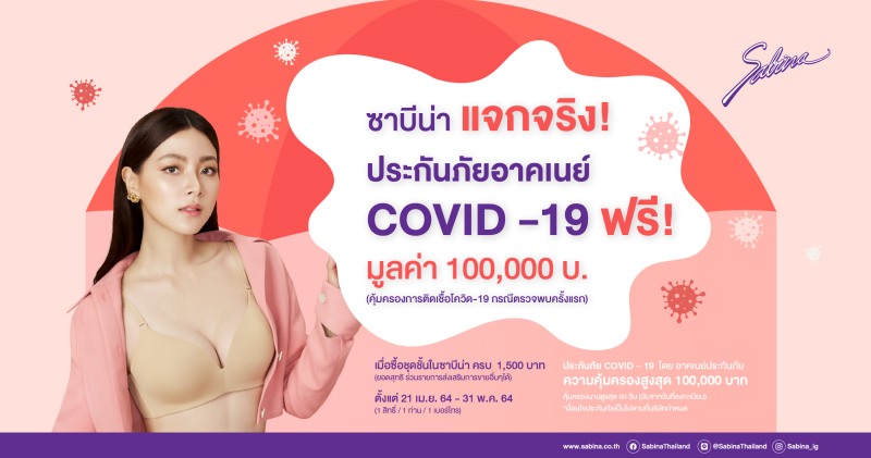 ทั้งนี้ลูกค้าที่ใช้จ่ายผ่านเคาน์เตอร์ซาบีน่าทุกสาขา กรณีตรวจพบครั้งแรก จะได้รับความคุ้มครองทันที 100,000 บาท คุ้มครองนานสูงสุด 90 วัน (ระยะเวลารอคอย นับจากวันที่ลงทะเบียน 14 วัน) เมื่อซื้อสินค้าครบตามเงื่อนไข เพียงซื้อชุดชั้นในซาบีน่าครบ 1,500 บาท (ยอดสุทธิหลังหักส่วนลดรายการส่งเสริมการขายภายในร้านค้าแล้ว) รับฟรีทันที ประกันภัยโควิด-19 จากอาคเนย์ประกันภัย เริ่มตั้งแต่วันที่ 21 เมษายน พ.ศ.2564 ถึงวันที่ 31 พฤษภาคม พ.ศ.2564 ที่เคาน์เตอร์ซาบีน่า และซาบีน่าช็อป ทุกสาขาทั่วประเทศ สอบถามเพิ่มเติม ทาง Sabina Call Center 02-422 9430 หรือทาง LineOA : @SabinaThailand
