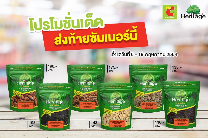 เครือเฮอริเทจ ผู้ผลิตและจัดจำหน่ายอาหารและเครื่องดื่มเพื่อสุขภาพ จัดโปรโมชั่นส่งท้ายซัมเมอร์เอาใจคนรักสุขภาพ ด้วยสินค้ามากมาย ได้แก่ เฮอริเทจลูกพรุนไร้เมล็ด ขนาด 500 กรัม ราคาโปรโมชั่น 198 บาท ราคาปกติ 215 บาท, เฮอริเทจ อัลมอนด์ดิบเม็ดเต็ม ขนาด 250 กรัม ราคาโปรโมชั่น 196 บาท ราคาปกติ 214 บาท, เฮอริเทจ วอลนัทดิบ ขนาด 200 กรัม ราคาโปรโมชั่น 175 บาท ราคาปกติ 190 บาท, เฮอริเทจ เมล็ดมะม่วงหิมพานต์ดิบเม็ดเต็ม ขนาด 250 กรัม ราคาโปรโมชั่น 143 บาท ราคาปกติ 156 บาท, เฮอริเทจ เมล็ดทานตะวันอบ ขนาด 500 กรัม ราคาโปรโมชั่น 133 บาท ราคาปกติ 145 บาท และ เฮอริเทจ ลูกเกดดำ ขนาด 500 กรัม ราคาโปรโมชั่น 110 บาท ราคาปกติ 120 บาท
