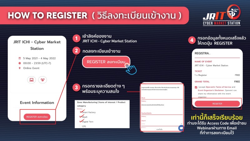 สำหรับผู้ประกอบการหรือผู้ที่สนใจสามารถเข้าร่วมกิจกรรมสัมมนาครั้งนี้ฟรี ไม่มีค่าใช้จ่าย ด้วยการลงทะเบียนที่หน้าเว็บไซต์ของงาน JRIT ICHI Cyber Market Station (https://bit.ly/2P8aPDM) โดยทีมงานจะทำการยืนยันการลงทะเบียน และส่ง Access Code เพื่อเข้าชม Webinar ผ่านทางอีเมล์ที่ลงทะเบียนไว้ หรือสอบถามข้อมูลเพิ่มเติมได้ที่หมายเลขโทรศัพท์ 02-168-7838