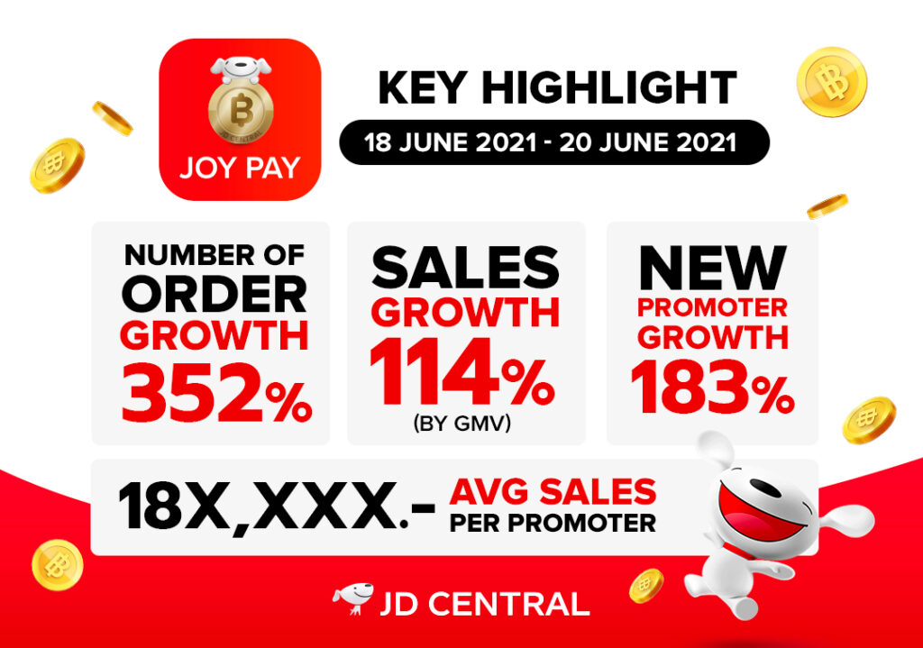 JD CENTRAL ประกาศความสำเร็จอีกครั้งกับแคมเปญ “JD CENTRAL SUPER JOY MID-YEAR GRAND SALE” ที่จัดขึ้นในช่วงเดือนมิถุนายนที่ผ่านมา โดยแอป “JOY PAY” คุณแชร์ เราเปย์ ช่วยสร้างรายได้ออนไลน์ให้กับคนไทย ทุบสถิติยอดคำสั่งซื้อโตพุ่งถึง 352% สร้างรายได้กว่า 180,000 บาท ให้พ่อค้าแม่ค้าออนไลน์ได้ใน 3 วัน! ชูเป็นหนึ่งทางเลือกสร้างอาชีพเสริมให้คนไทยในช่วงวิกฤติ Covid-19
