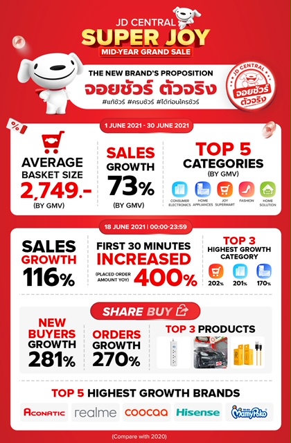 คุณก่อลาภ สุวัชรังกูร ประธานกรรมการบริหารฝ่ายการตลาด เจดีเซ็นทรัล กล่าวว่า ในช่วงกลางปีที่คนไทยยังคง Work from Home และลดความเสี่ยงจากการเดินทางออกนอกบ้าน เพราะวิกฤติ Covid-19 การช้อปปิ้งออนไลน์จึงเป็นสิ่งตอบโจทย์นักช้อปที่กำลังมองหาดีลและส่วนลดสุดพิเศษ สะท้อนถึงความสำเร็จของแคมเปญ JD CENTRAL SUPER JOY MID-YEAR GRAND SALE ที่ได้กระแสตอบรับที่ดีจากลูกค้าเพิ่มขึ้นถล่มทลาย ด้วยอัตรายอดขายเติบโตสูงถึง 73% ยอดการซื้อต่อครั้งเฉลี่ย 2,749 บาท