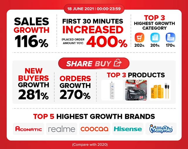 เมื่อเทียบกับช่วงต้นปีที่ผ่านมาแล้ว พบว่าฟีเจอร์ Share Buy หรือการแชร์กันซื้อแบบเป็นกลุ่ม ได้รับความนิยมจากนักช้อปเป็นอย่างมาก โดยมีอัตราการเพิ่มขึ้นของลูกค้าใหม่ถึง 281%* และจำนวนออเดอร์ของสินค้าเพิ่มขึ้นถึง 270%* อันเป็นผลมาจากโปรแรงและดีลพิเศษจากสินค้าแบรนด์ดังมากมาย โดยเฉพาะ 3 หมวดหมู่สินค้าที่มีอัตราการสั่งซื้อสูงสุด ได้แก่ เครื่องอุปโภคบริโภค สินค้าอิเล็กทรอนิกส์ และเครื่องใช้ในบ้าน ซึ่งสินค้าที่ได้รับความนิยมและมีอัตราการเติบโตสูงสุด คือ ปลั๊กไฟต่อพ่วง คูปองดีลพิเศษบริการคาร์แคร์ และสายอุปกรณ์ USB อันเนื่องมาจาก สถาณการณ์ Covid-19 ที่ผู้คนต่างต้องการสิ่งอำนวยความสะดวกในการทำงานที่บ้าน และการบริการที่เกี่ยวกับการทำความสะอาด (*ตัวเลขอ้างอิงเปรียบเทียบจากเดือนมกราคม 2021 โดยดูมูลค่าจาก GMV)