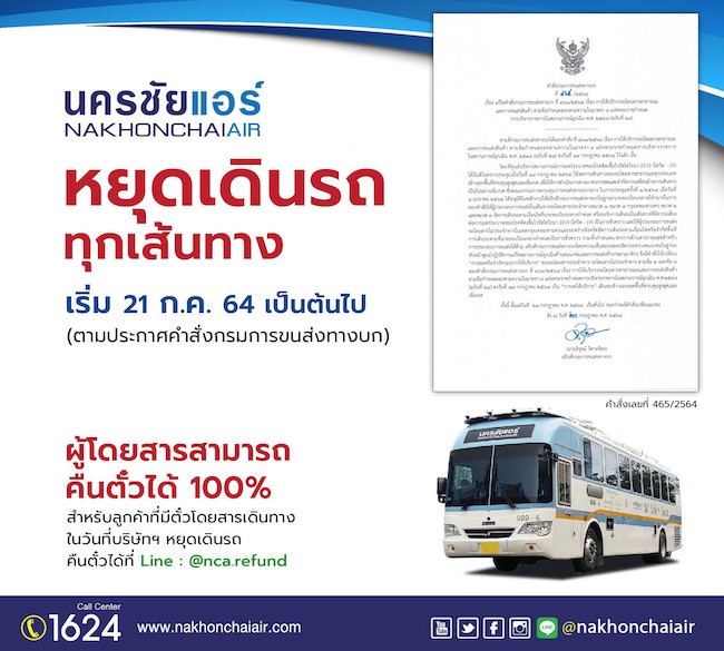 คุณเครือวัลย์ วงศ์รักมิตร ประธานกรรมการ บริษัท นครชัยแอร์ จำกัด เปิดเผยว่า ตามคำสั่งกรมการขนส่งทางบกที่ 465/2564 ตามพระราชกำหนดการบริหารราชการในสถานการณ์ฉุกเฉิน พ..2548 (ฉบับที่ 28) ลงวันที่ 20 กรกฎาคม 2564 รัฐบาลได้ประกาศให้งดให้บริการ เดินรถเข้าออกเขตพื้นที่ควบคุมสูงสุดและเข้มงวด ตั้งแต่วันที่ 21 กรกฎาคม 2564 เป็นต้นไป บริษัทฯ จึงมีความจำเป็นต้องขอหยุดการเดินรถตามนโยบายของกรมการขนส่งทางบกในช่วงระยะเวลานี้ สำหรับผู้โดยสารที่มีตั๋วเดินทางตั้งแต่วันที่ 21 กรกฎาคม 2564 เป็นต้นไป สามารถเดินทางใหม่ได้ภายใน 365 วัน นับจากวันที่ระบุบนตั๋วโดยสารใบเดิม โดยในระหว่างนี้ผู้โดยสารไม่ต้องดำเนินการใดๆ ระบบจะดำเนินการเลื่อนตั๋วโดยไม่ระบุวันเดินทางให้โดยอัตโนมัติ และลูกค้าสามารถคืนตั๋วได้ 100% ผ่านบริการ NCA Refund ทางLine : @nca.refund ให้ลูกค้าทำรายการได้โดยไม่ต้องเดินทางมาที่สถานีฯ นครชัยแอร์ เพิ่มความสะดวกสำหรับผู้มีความจำเป็นต้องยกเลิกการเดินทาง