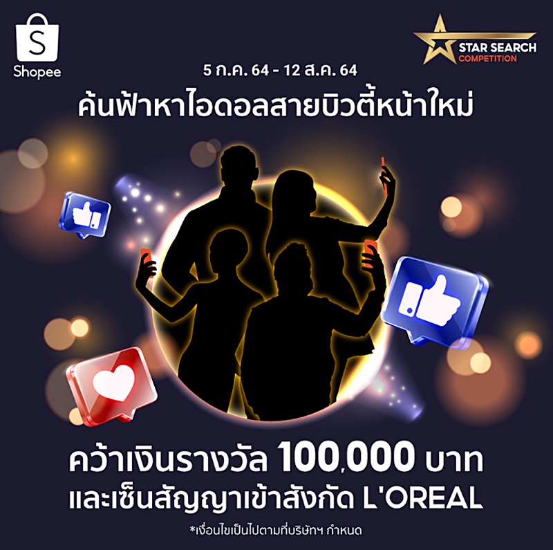‘Star Search Competition’ เปิดโอกาสให้ชาวไทยทุกเพศ อายุตั้งแต่ 16 ปี มาโชว์ความสามารถในการไลฟ์สตรีมเพื่อนำเสนอคอนเท้นต์สุดสร้างสรรค์ให้กับผลิตภัณฑ์และแคมเปญต่างๆ ของแบรนด์ในบริษัท ลอรีอัล ประเทศไทย ผ่านฟีเจอร์ ‘Shopee Live’ โดยผู้ที่ผ่านการคัดเลือกจะได้เข้าร่วมเอ็กซ์คลูซีฟเวิร์คช็อปกับแบรนด์ต่างๆ เช่น L’Oreal Paris, Garnier, Maybelline New York, Biotherm และ IT Cosmetics รวมถึงผู้เชี่ยวชาญด้านไลฟ์สตรีมจากช้อปปี้ และยังได้เซ็นสัญญาร่วมงานกับแบรนด์ในเครือลอรีอัล ประเทศไทย พร้อมรับรางวัลเงินสดรวมมูลค่า 100,000 บาท สามารถสมัครได้ตั้้งแต่วันนี้ – 18 กรกฏาคมนี้