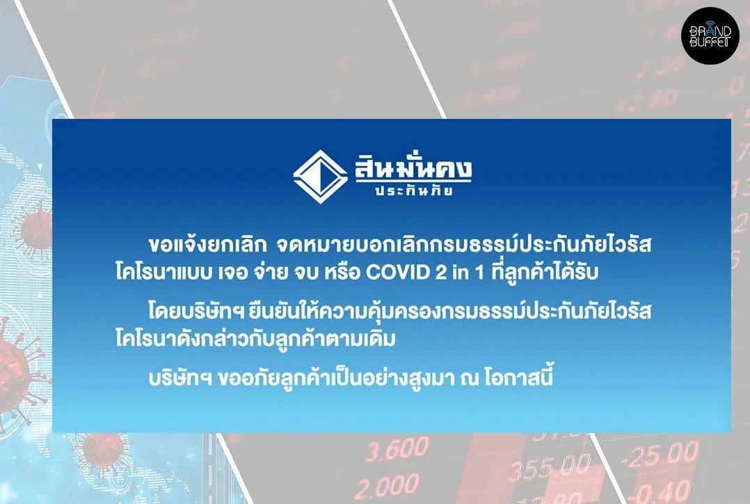 หลังจากวันที่ 16 กรกฎาคม 2564 บริษัท สินมั่นคงประกันภัย จำกัด (มหาชน) ประกาศแจ้งลูกค้าขอใช้สิทธิตามเงื่อนไข “บอกเลิก” กรมธรรม์ประกันภัยโควิดแบบ “เจอ จ่าย จบ” หรือ COVID 2 in 1 เพื่อลดความเสี่ยงจากยอดเคลมประกันในสถานการณ์ผู้ติดเชื้อโควิด-19 ที่เพิ่มขึ้นต่อเนื่อง