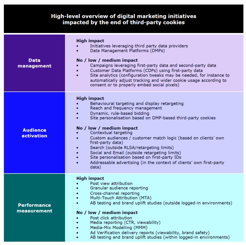 จากประเด็นดังกล่าว คุณคมจักร กำธรพสินี Head of Performance Marketing สายงานบริหารธุรกิจสื่อ กลุ่ม เดนท์สุ อินเตอร์เนชั่นแนล ประเทศไทย กล่าวว่า “จากการประเมิน ผลกระทบหลักที่นักการตลาด จะต้องเจอหลังการปลดล็อคเข้าสู่ยุค Cookiesless นั่นคือ การทำ Ad Personalization จะยากขึ้นกว่าเดิมอย่างมาก เนื่องจากการหา interest ของผู้บริโภคทำได้ยากยิ่งขึ้น ยิ่งไปกว่านั้น การทำ frequency capping เพื่อควบคุมปริมาณของการแสดงโฆษณาให้เหมาะสม จะทำได้อย่างจำกัดและนอกจากนี้ การใช้ Machine Learning เข้ามาช่วยศึกษาข้อมูลผู้บริโภค ในรูปแบบ cross-platform จะไม่สามารถทำได้อีกต่อไปทำให้ การทำ Re-marketing ก็จะถูกจำกัดโดยสิ้นเชิง และการวัดผล Assisted Conversion ข้ามเว็บไซต์จะไม่สามารถเก็บข้อมูลได้อย่างมีประสิทธิภาพอีกต่อไป”