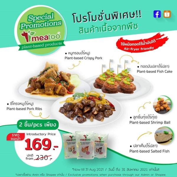 ล่าสุดฟู้ดดีฮับ เอาใจกลุ่มลูกค้าสายรักสุขภาพส่งโปรโมชั่นประจำเดือนสิงหาคมนี้ รับส่วนลด 25% เมื่อซื้อผลิตภัณฑ์อาหารเนื้อจากพืช ภายใต้แบรนด์ MEATOO ทั้งหมด และโปรโมชั่นสุดพิเศษสำหรับกลุ่มลูกค้าสายรักอาหารซีฟู้ด ซื้อชุดบัดดี้ ชุดเซ็ตอาหารทะเลสุดคุ้ม ในราคาเหมาเพียง 555 บาท อาทิ