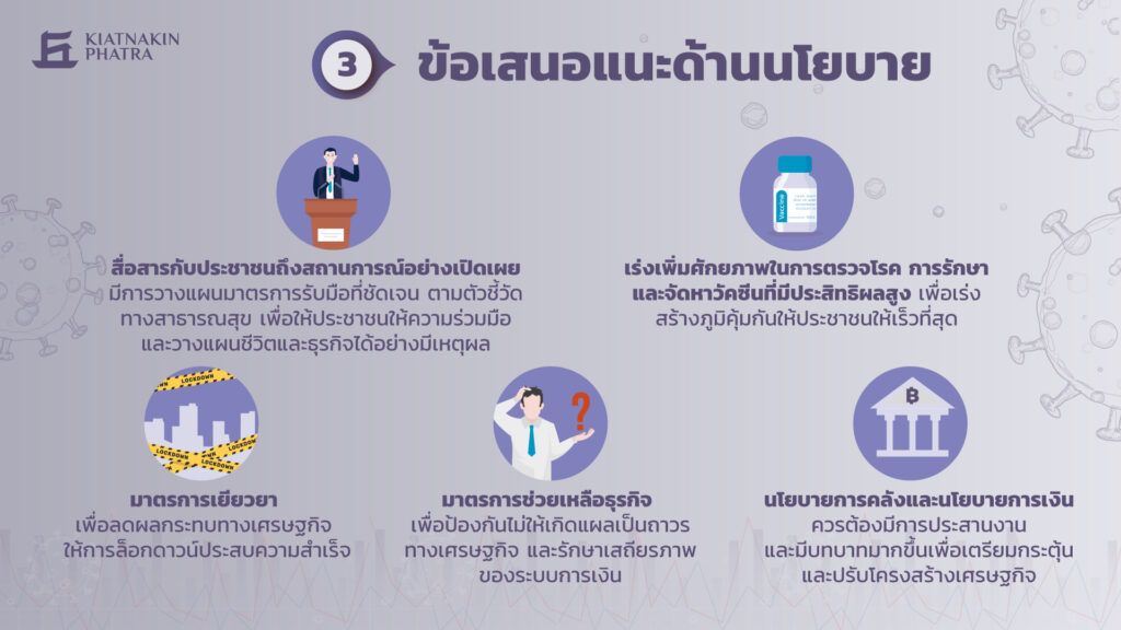 ทั้งนี้ การหยุดชะงักของกิจกรรมทางเศรษฐกิจที่รุนแรงและยาวนานกว่าการระบาดสองครั้งแรก จะส่งผลอย่างรุนแรงต่อวิถีชีวิต การจ้างงาน กระแสเงินสด ฐานะทางการเงิน และความสามารถในการจ่ายคืนหนี้ของครัวเรือนและธุรกิจขนาดกลางและขนาดเล็ก ดังนั้น จึงแนะรัฐบาลจำเป็นต้องเร่งทำใน 5 เรื่องตอนนี้ เพื่อควบคุมการระบาดและลดผลกระทบจากมาตรการล็อกดาวน์