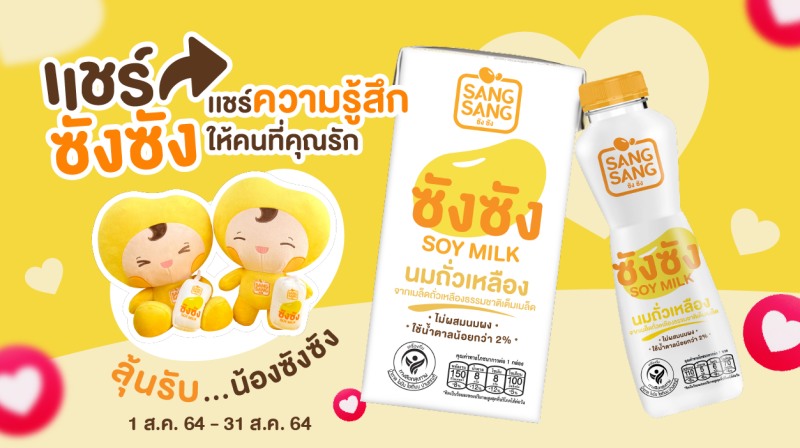 “ซังซัง” นมถั่วเหลืองคั้นสด ผลิตจากเมล็ดถั่วเหลืองจากประเทศแคนาดา รสชาติอร่อย หอมมัน และมีน้ำตาลน้อยกว่า 2% ชวนมาร่วมส่งความรัก ความคิดถึง ความห่วงใยให้กัน ผ่านช่องทางโซเชียลในกิจกรรม “แชร์ซังซัง แชร์ความรู้สึกให้คนที่คุณรัก” ลุ้นรางวัลกิ๊ฟท์เซ็ทซังซัง พร้อมตุ๊กตาน้องซังซังคละแบบ 15 รางวัล เพียงถ่ายรูปซังซังเเบบกล่องหรือขวด และใส่แคปชันแสดงความรักความห่วงใยให้กำลังใจตามสไตล์คุณ โพสต์ลงในโซเชียลของตนเอง ติด #ซังซัง #SangSang #SangsangSoymilk พร้อมแท็กคนที่คุณห่วงใย ตั้งค่าเป็นสาธารณะ จากนั้นเเคปรูปโพสต์นำมาคอมเม้นต์ใต้กิจกรรมนี้