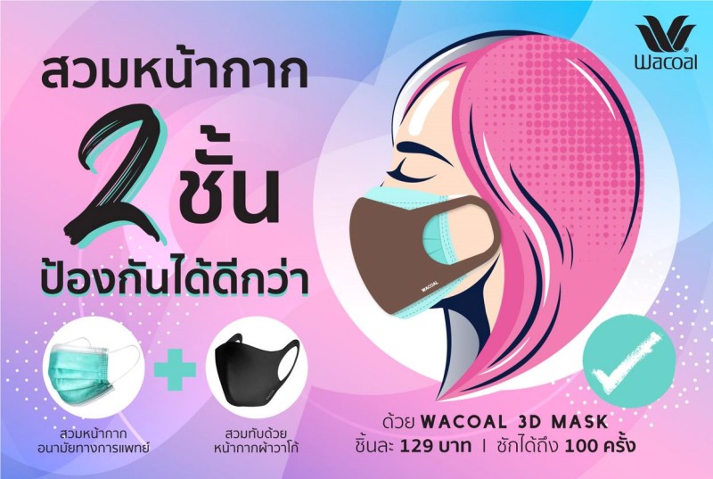 เพื่อเป็นการลดความเสี่ยงพร้อมลดค่าใช้จ่าย ด้วยการสวมหน้ากากผ้าวาโก้ “Wacoal 3D Mask” เนื้อผ้าสเปเซอร์ ผลิตจากเส้นใย Nylon 70% ขนาดเล็กระดับ Microfiber มีความละเอียดสูง อีกทั้งมีส่วนผสมของ Spandex Melt 30% หลอมละลายยึดติดเข้ากับโครงสร้างผ้า ซึ่งถักแบบ 2 ชั้น (Interlock Knit) ด้วยเครื่องถักที่มีความหนาแน่นสูง ทำให้ผ้ามีความอ่อนนุ่ม ไม่รุ่ย ไม่รัน ไม่ม้วน ยืดหยุ่นตัวดี กระชับเข้ากับรูปหน้าเมื่อสวมใส่ ผ่านการรับรองมาตรฐานความปลอดภัยจากสี และสารเคมีอันตราย มอก.2346:2550 และผ่านการทดสอบการผ่านของอากาศ (Air Permeability Test) เป็นไปตามข้อกำหนดของสถาบันพัฒนาอุตสาหกรรมสิ่งทอ ได้ค่าการผ่านอากาศได้น้อยกว่า 50 cm³/cm²/sec. จึงมีประสิทธิภาพในการกรองฝุ่น PM 2.5 และยังช่วยลดการกระจายของเชื้อโรค สามารถซักทำความสะอาดและนำกลับมาใช้ซ้ำได้มากถึง 100 ครั้ง